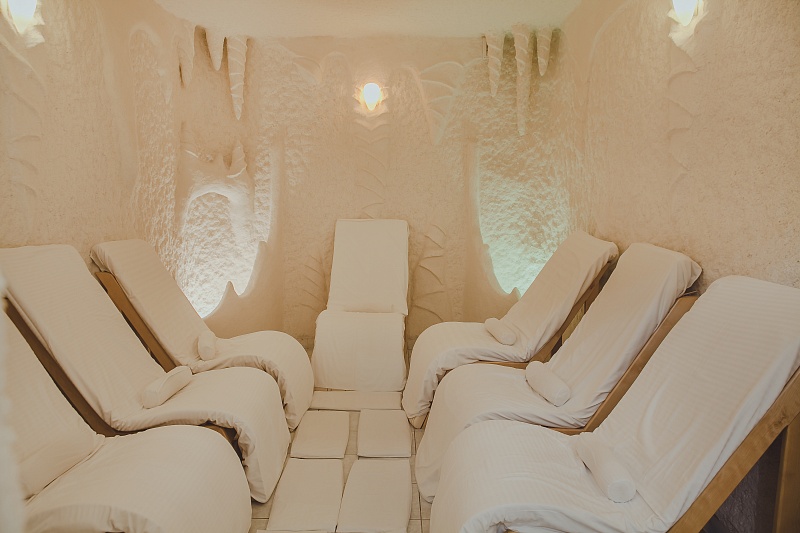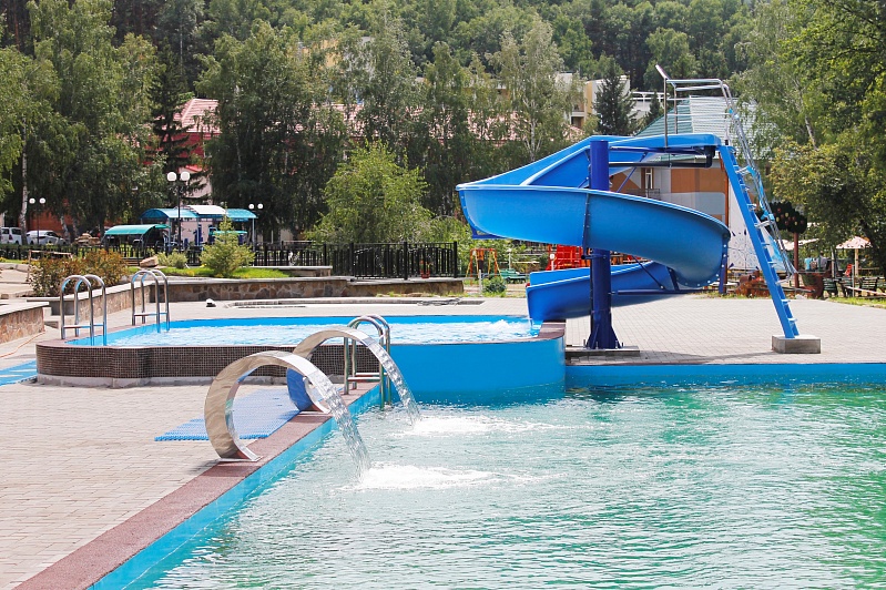 В чаше бассейна расположены водные аттракционы: гейзер и водопад, которые относятся к категории гидромассажа и благотворно влияют на организм человека. Термотерапия – очень важное направление в оздоровлении организма при санаторно-курортном лечении. Турецкий хамам и сауна расположены перед плавательным бассейном, что делает посещение более комфортным и полезным для здоровья.