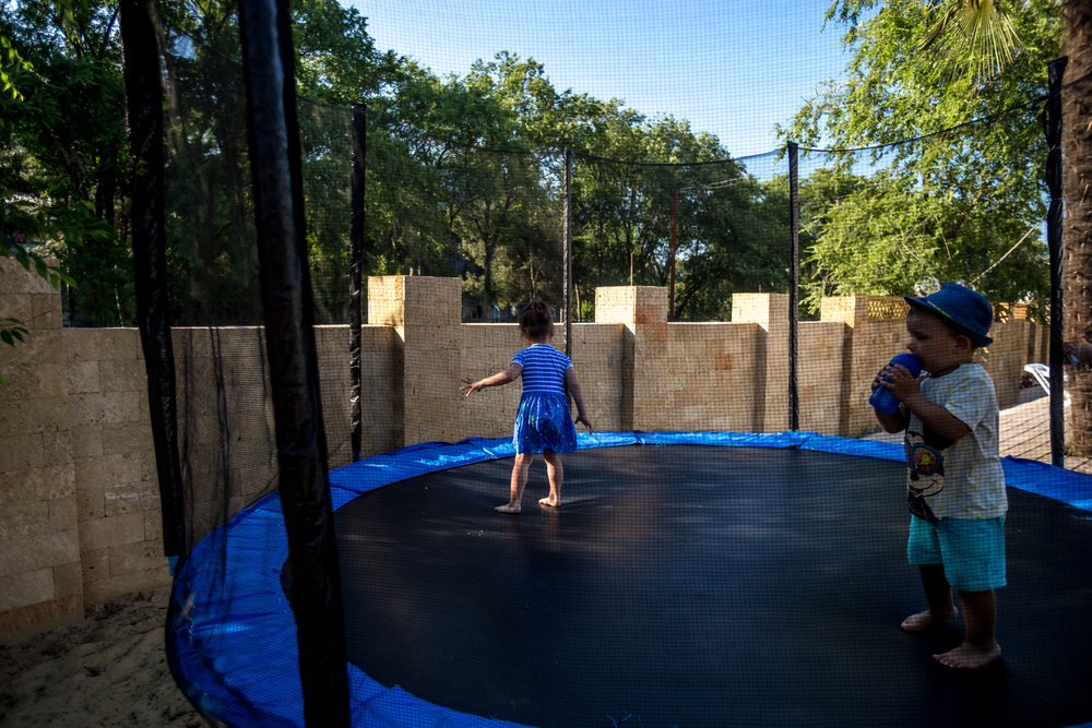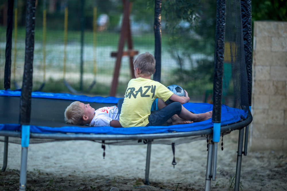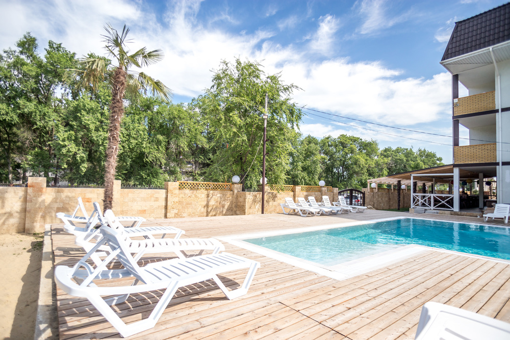 зоной для детей, шезлонги и игровую площадку с батутом, кафе-бар у