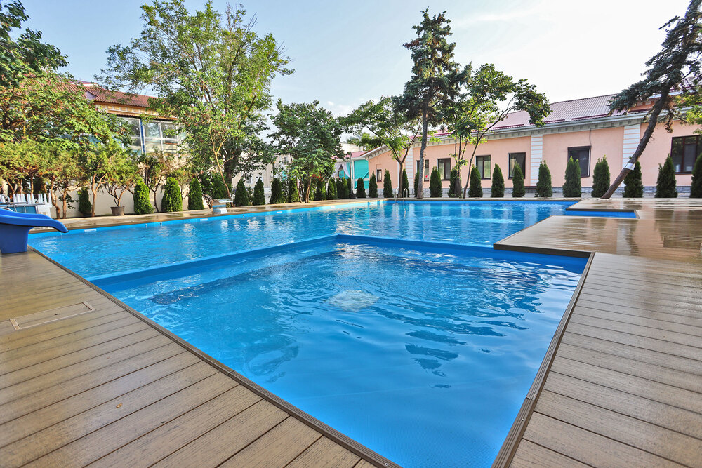 - бассейн с подогревом, для детей мини-бассейн, детская площадка, спортивная площадка (футбол, баскетбол, теннис большой), батут
