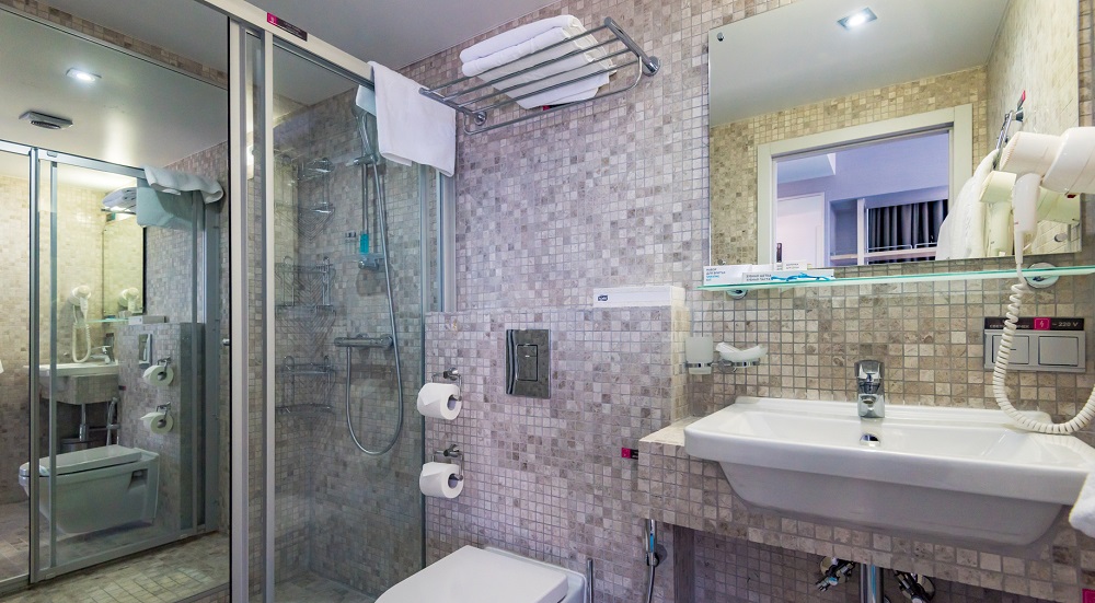 - ванная комната с душевой кабиной, феном и косметикой на основе натуральных масел: мыло, шампунь, гель для душа