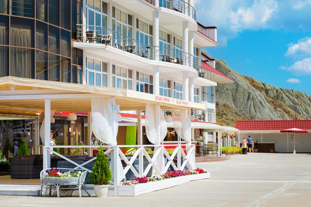 ГК "Белый Грифон" расположен в одном из красивейших мест Крымского полуострова - в курортном поселке Коктебель, который отличается особой энергетикой. Выгодное расположение на самом берегу моря у подножья потухшего вулкана Кара-Даг сделало возможным открытие единственного в Коктебеле дайвинг-центра международного стандарта по системе обучения PADI. В отеле оборудовано подъемное устройство и причал для проката яхт, катеров, гидроциклов. Рядом с отелем расположен приватный, "мальтийский" пляж. В отеле есть ресторан с великолепным видом на Коктебельский залив. В гостиничном комплексе расположен конференц-зал на 60 человек с идеальными условиями для проведения конференций, корпоративных мероприятий, семинаров и тренингов, предоставляется бесплатная услуга Wi-Fi