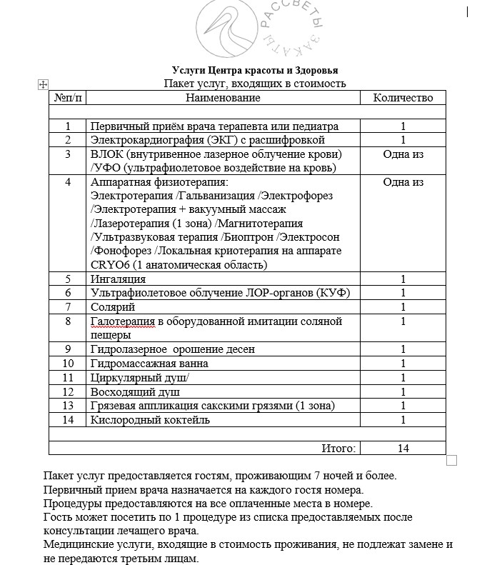 Внимание! При проживании от 7 суток в стоимость входят услуги центра красоты и здоровья (подробнее)