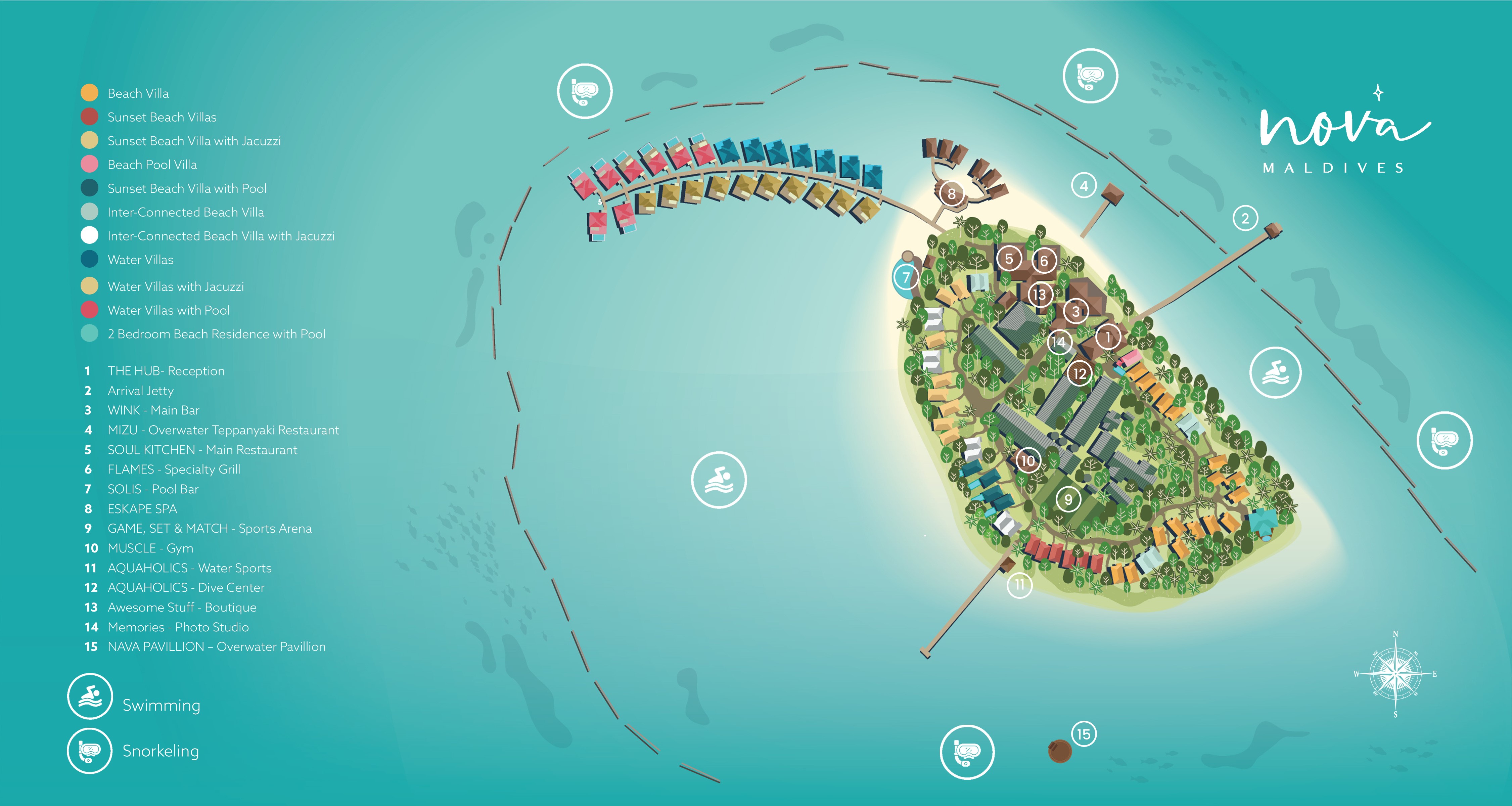 разноцветных рифовых рыб. У острова прекрасный домашний риф до которого легко доплыть с берега. Приложение Nova (интерфейс на русском языке) позволяет гостям найти полную информацию о курорте, включая карту отеля, ежедневные мероприятия на острове, СПА, а также легко и удобно бронировать услуги, например, столик в Аля-карт ресторане