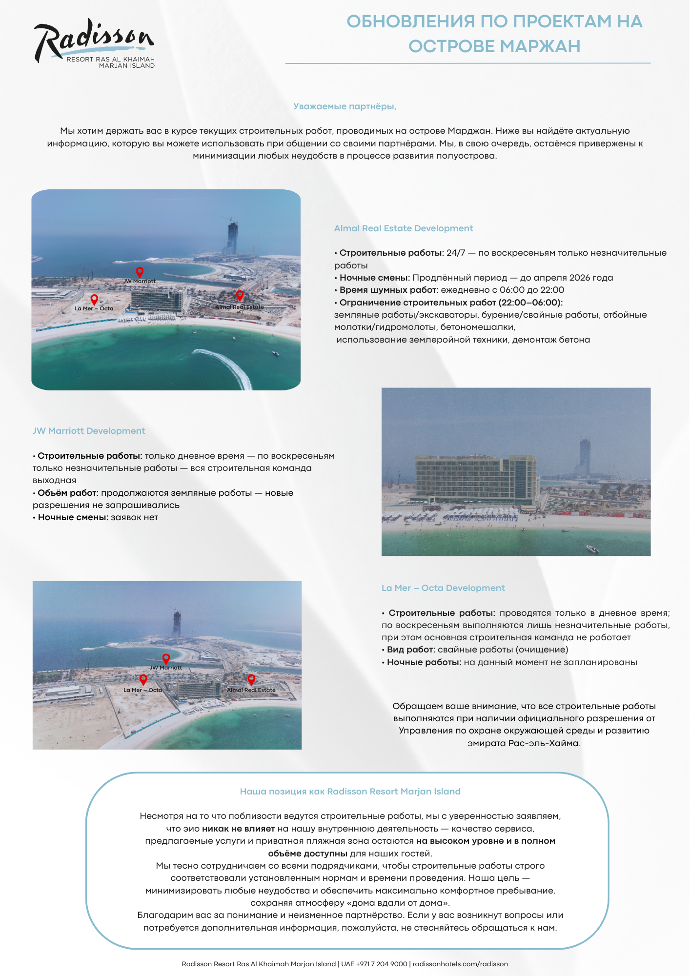 Внимание! Рядом с отелем с левой и правой стороны на острове Marjaan проходят работы по исследованию почвы и строительству. А также ведётся строительство недвижимости Almal (работы проводятся 24/7), нового отеля JW Marriott, а также строительство La Mer Octa и Nobu (работы проводятся в дневное время).