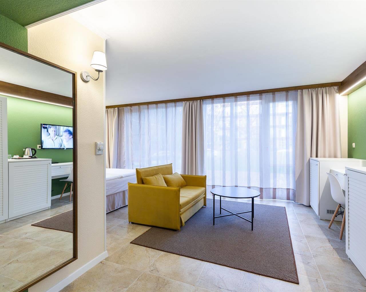 и различных торговых точек. К услугам гостей отеля комфортные номера различных категорий, кафе со шведской линией, конференц-зал вместимостью до 100 человек, закрытая парковка на 19 мест