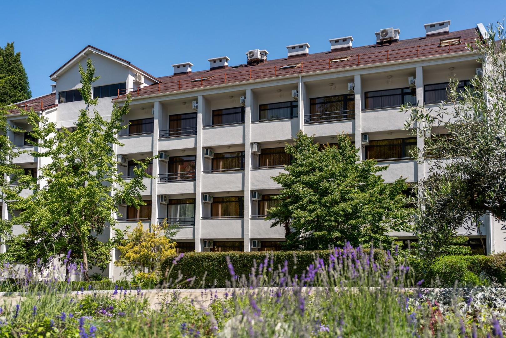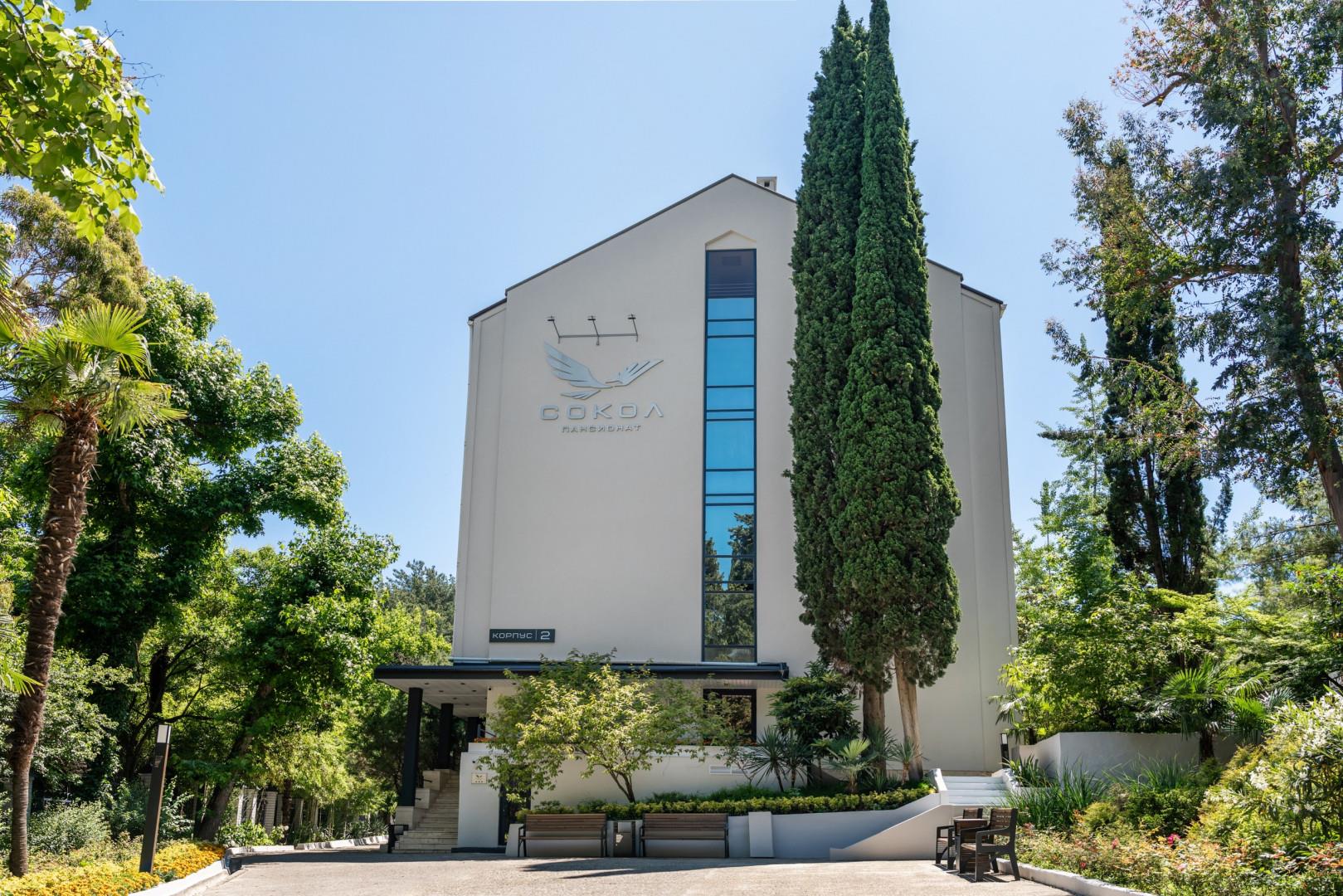 Пансионат "Сокол" расположен в центре Сочи в окружении настоящего реликтового леса с кипарисами, хвойными и экзотическими деревьями. На территории работает большой открытый бассейн с зоной для отдыха, принятия солнечных ванн и кафе с фреш баром. Гостям предлагается 3-разовое питание по системе "шведский стол", есть детский веревочный парк с инструктором, площадка для пляжного волейбола, настольный теннис, парковая зона, платная охраняемая открытая парковка