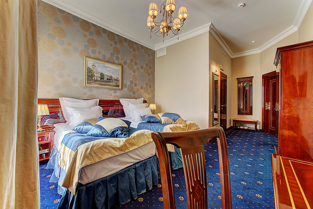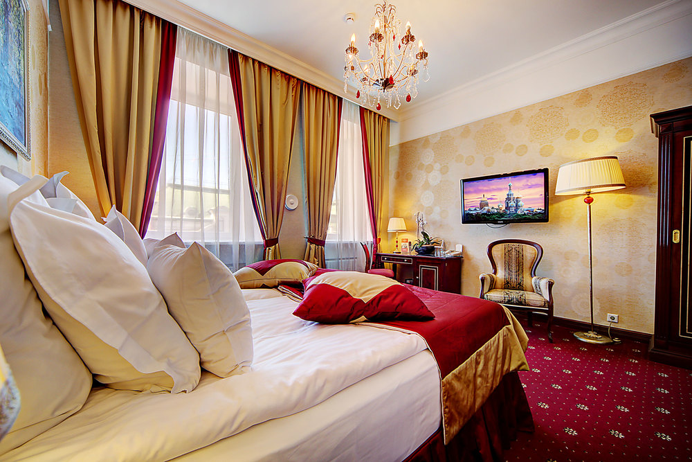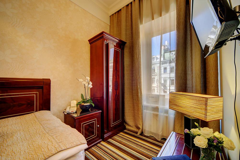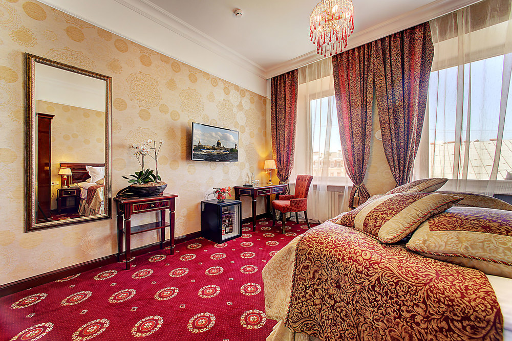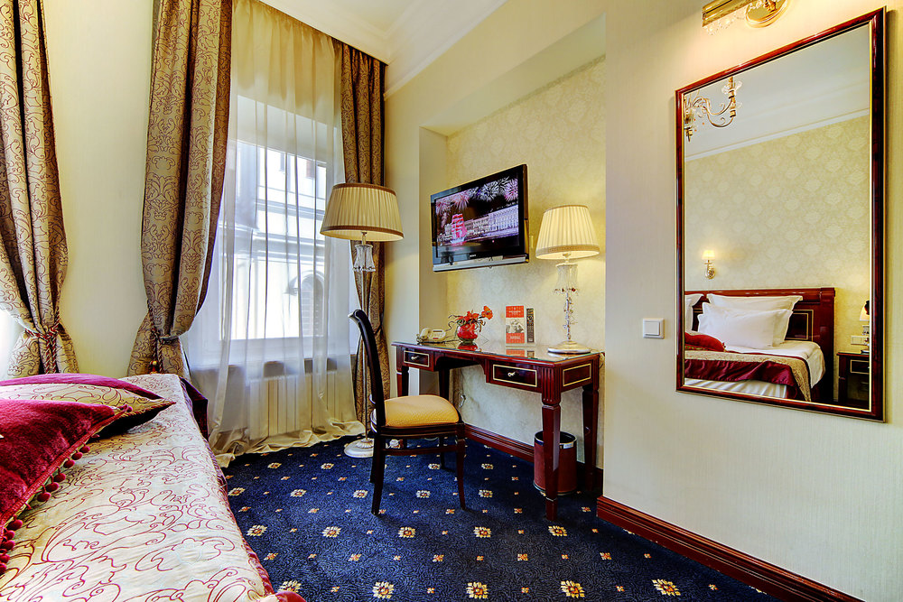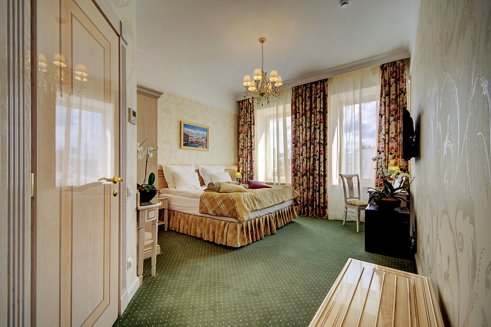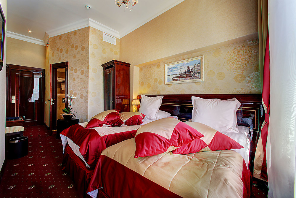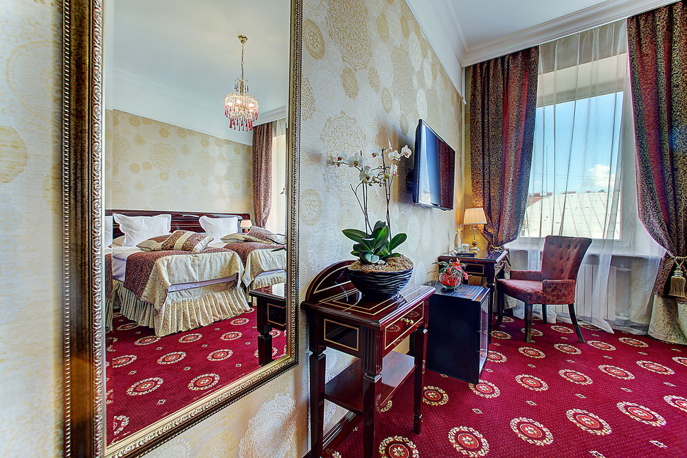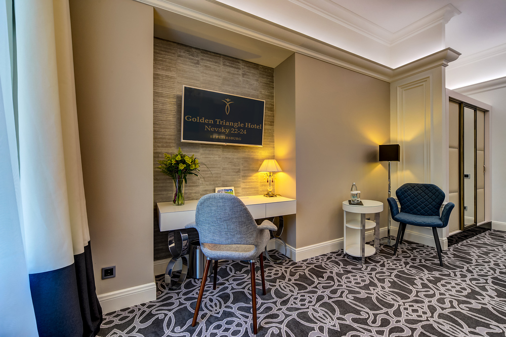 Бутик-отель "Золотой Треугольник" - это неповторимая концепция тематического дизайна, эксклюзивный шарм, удобное расположение на Невском проспекте всего в 5 минутах от Эрмитажа, Дворцовой площади, Казанского собора и Спаса на крови, высочайшее качество обслуживания и особенная атмосфера элегантной роскоши. В отеле комфортабельные номера с видом на Большую Конюшенную улицу и Лютеранскую церковь. Отделка номеров выполнена по проектам трех именитых дизайнеров, победителей европейских арт-фестивалей. Органично используются натуральные материалы - красное дерево, мрамор, тканевые обои с различными фактурами. Дизайн интерьеров отражает основную концепцию гостиницы - элегантная роскошь в историческом окружении, эффектно подчеркнутая яркими деталями в виде хрустальных люстр и бра, живописных полотен с видами города и старинных каминов 19 века. К услугам гостей: великолепный завтрак "шведский стол"
