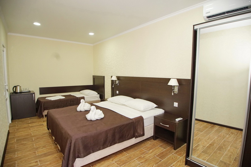 состоит из двух корпусов - 4-этажного и 5-этажного. В 20 м за территорией отеля есть все необходимое: кафе, столовые, магазины, аптеки