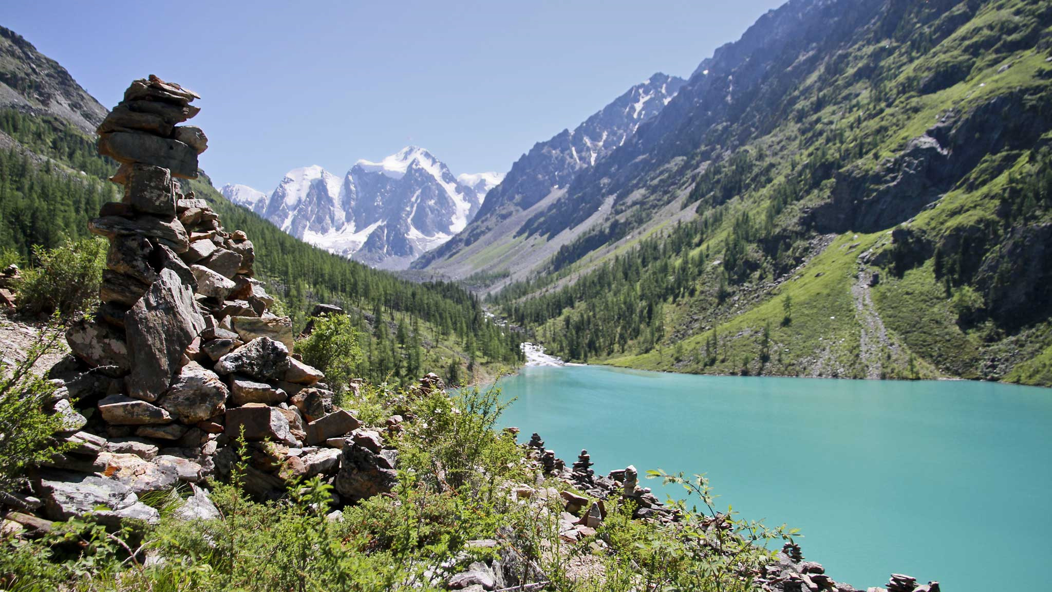 Горное Телецкое озеро с чистой водой, окружённое тайгой. Маршрут: водопад Корбу, экскурсии на теплоходе. Конные туры по долинам — маршруты от 3 до 10 дней, ночёвки в юртах. Гора Белуха — высшая точка Алтая, 4506 метров, для опытных альпинистов.